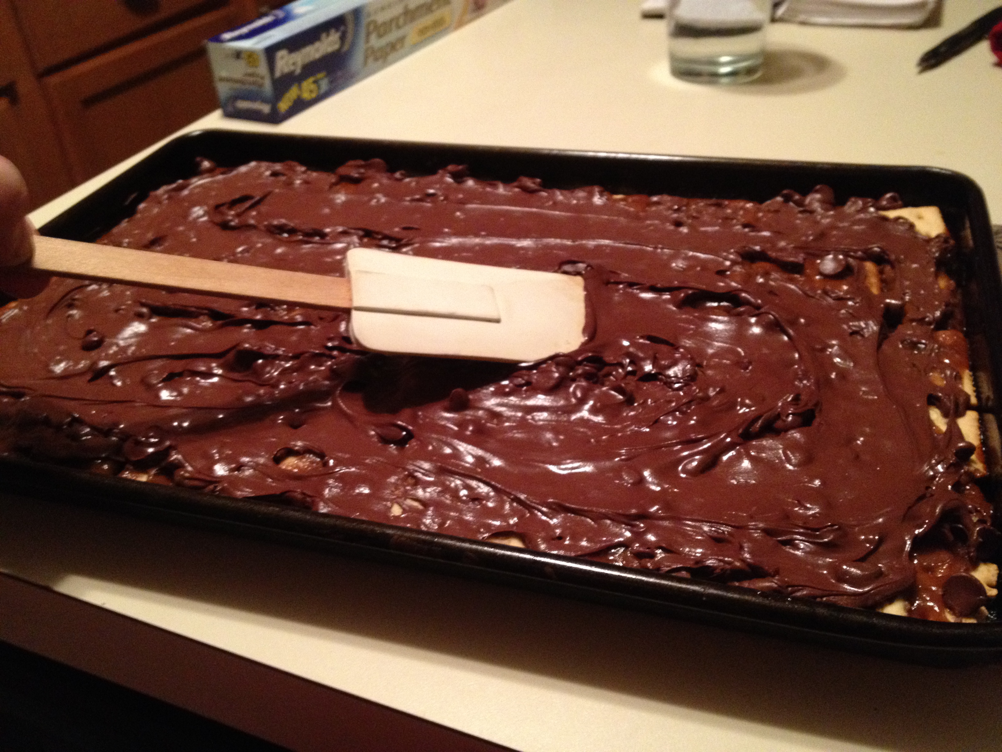 Bake caramel and crackers in a 400-degree oven for 5 minutes. Remove from oven and cover with chocolate, lightly spreading with a spatula for even distribution.